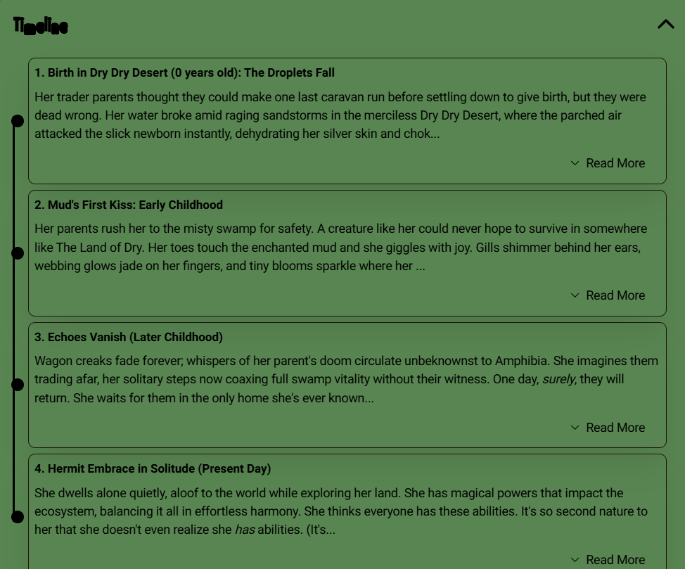- Event 4: Hermit life now. Solitude shapes her days. Date them loose. Age 0. Early childhood. Later childhood. Present day. Note what shifts. Desert builds grit. Swamp sparks magic. Loss carves wait. Powers grow quiet.