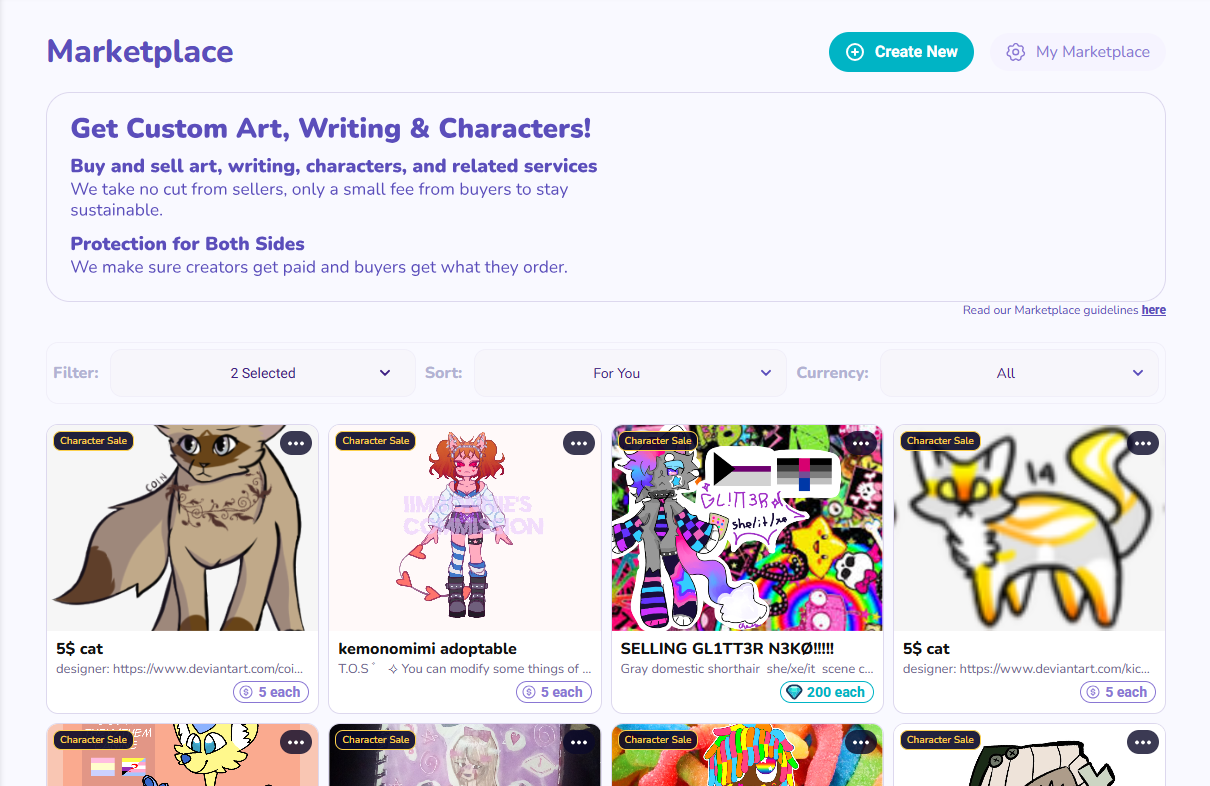 CharacterHub’s built-in marketplace is a handy place to list and discover characters. Artists can post their designs, set terms, and manage offers all in one spot. Buyers can browse by category and quickly see what is for sale, up for trade, or totally free.