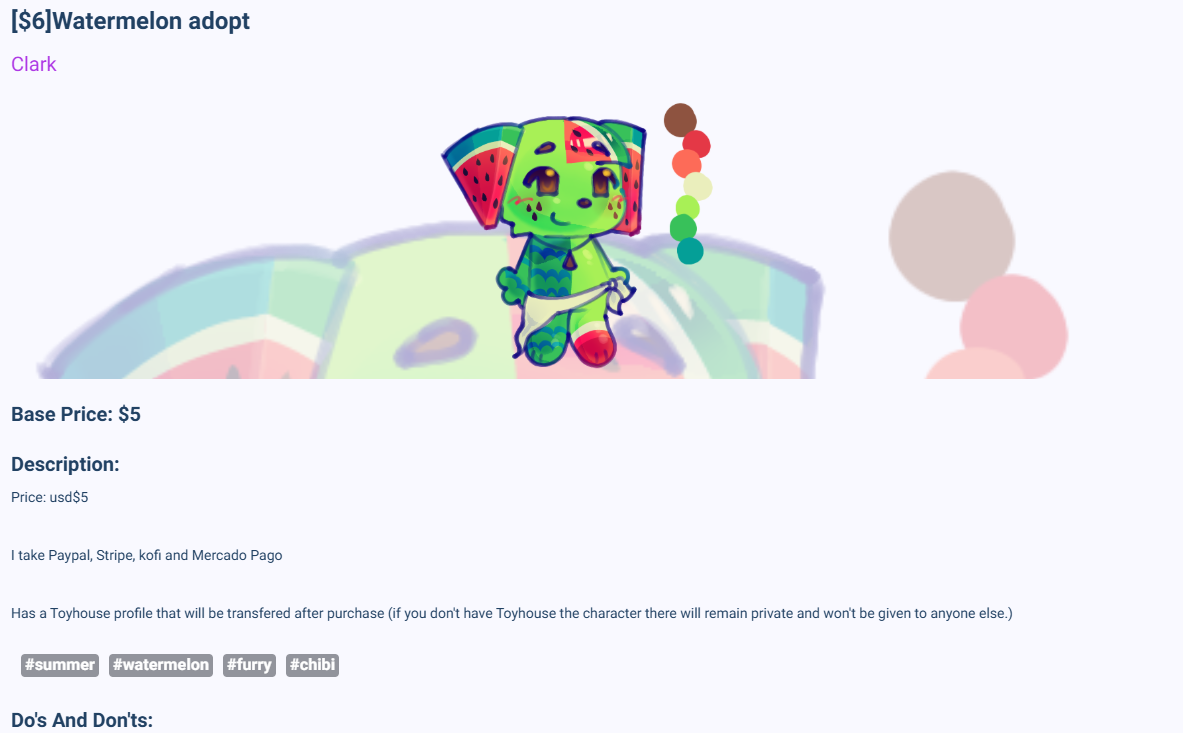 Like real life adoptions, character adoptions can have some rules and restrictions. Everyone’s boundaries are different. So, every artist’s ‘Do’s and Don’ts’ for their adoptable character will be different, too. For example, this creator does not allow their characters to be used to train AI or create NFTs. However, other creators may not mind these things. It all depends on the artist’s morals and values.